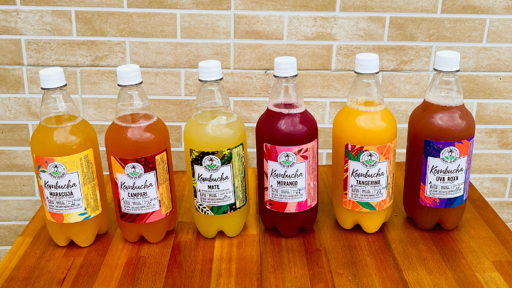 Kombucha com maracujá, gengibre e mel. Pode conter álcool em até 0,5% V/V.